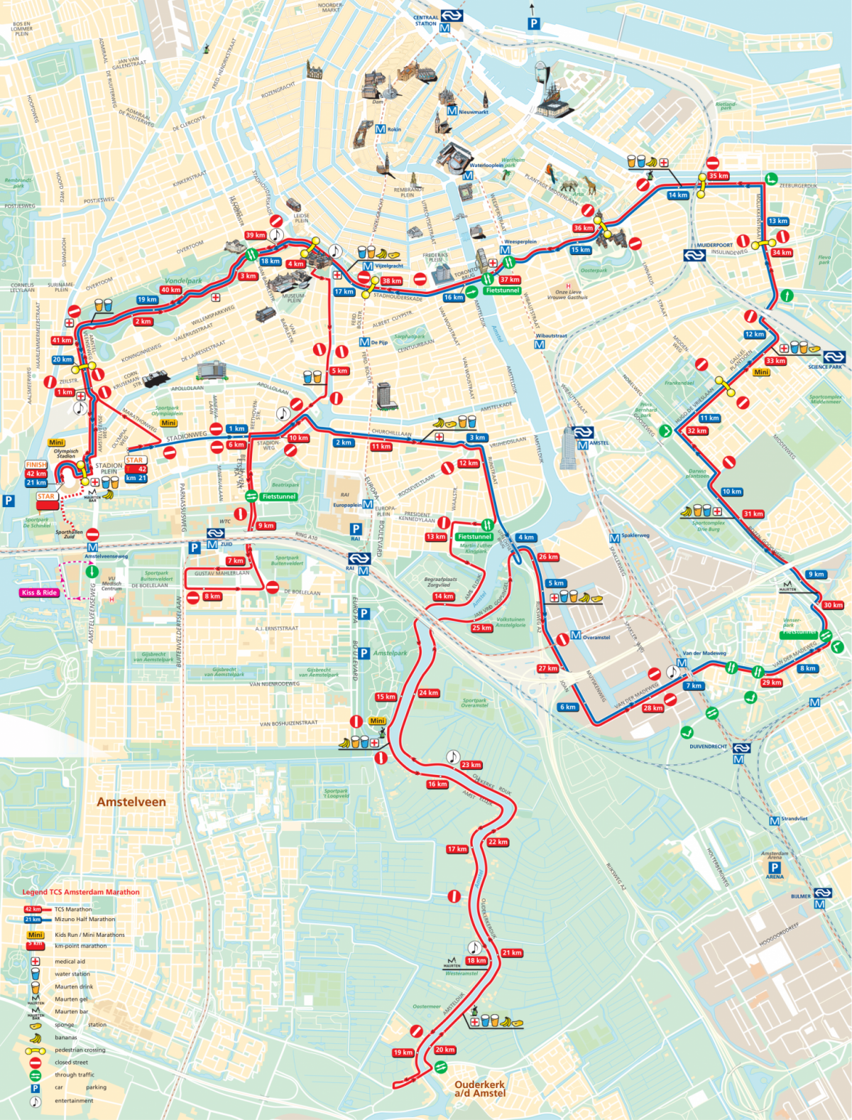 The Mizuno Half Marathon consists of one loop, most of which passes through the attractive centre of Amsterdam. The course starts at the Stadionweg and goes through Churchilllaan, Rijnstraat and the Utrechtse Bridge over the Amstel river. Next you run through Watergraafsmeer and Zeeburg. The rest of the course is the same as that of the full marathon.