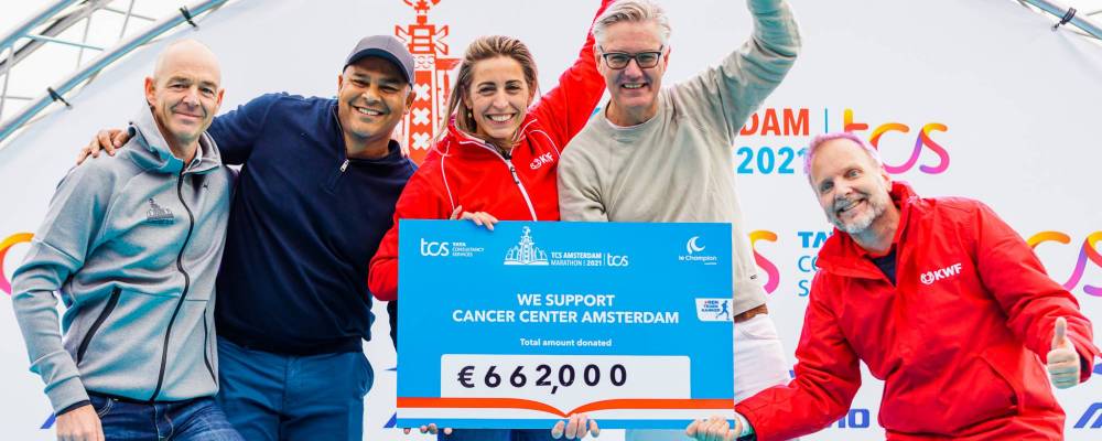 The TCS Amsterdam Marathon has joined forces with KWF Dutch Cancer Society this year to raise as much money as possible for ground-breaking cancer research at the Amsterdam UMC Cancer Center. Participants could not only make a voluntary contribution during their registration, but through the Ren tegen kanker platform, it was also possible to create their own action page. Through this initiative, no less than 600 runners came into action today. Thanks to all donations and title sponsor TCS, a record amount of money was raised today for research at the Cancer Center Amsterdam. Annemarieke Gottmer and Peter Neuhuis of KWF and Geert Kazemier of Cancer Center Amsterdam received a cheque of no less than € 662,000 during the International Award Ceremony. The cheque was presented by René Wit, race director of the TCS Amsterdam Marathon and Ashish Babu, CMO of TCS Europe and UK.