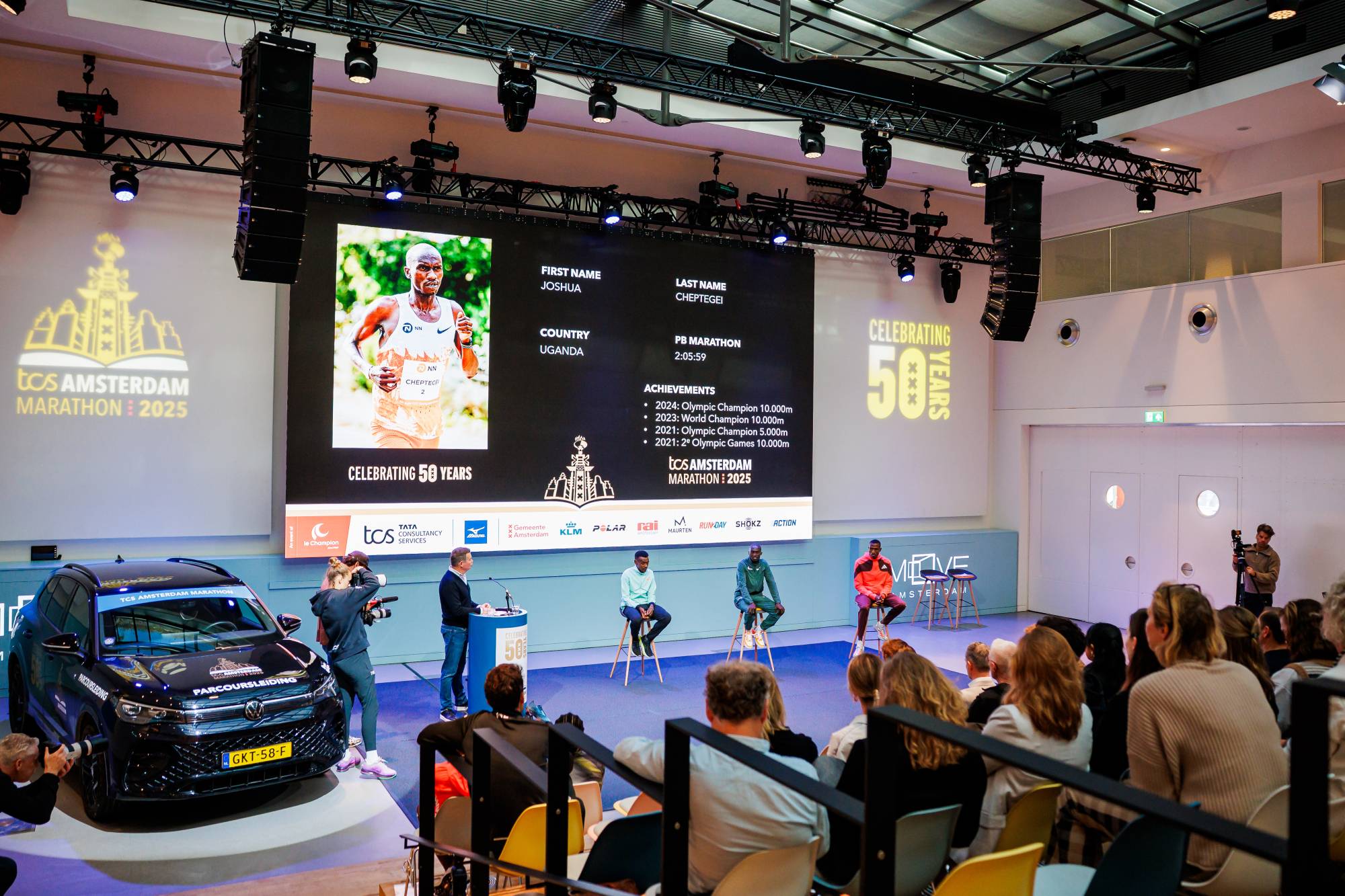 At this morning’s press conference at Move Amsterdam, overlooking the Olympic Stadium, athletes and organizers looked ahead to the anniversary edition of the TCS Amsterdam Marathon. Excitement is building for Sunday, when thousands of runners will set off from the Olympic Stadium. Among the men, top favorites Joshua Cheptegei and Gabriel Geay shared their ambitions, while Bertukan Welde and Bosena Mulatie are aiming for victory in the women’s race. Dutch athletes Khalid Choukoud and Anne Luijten hope to claim the national title on the familiar Amsterdam course.Training is complete, and the weather forecast promises fast times. Athlete manager Daan van den Berg of Global Sports Communication, representing event organizer Le Champion, said: “Early in the morning, temperatures will range between six and ten degrees Celsius with a moderate southeast wind (force 3). Runners will face a slight headwind during the first 19 kilometers, but can then benefit from a tailwind toward the finish. In Amsterdam, the second half is often faster than the first.”